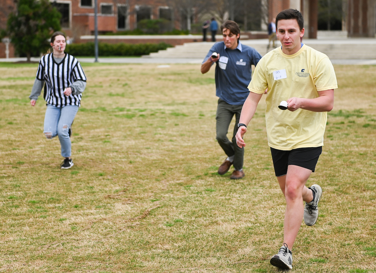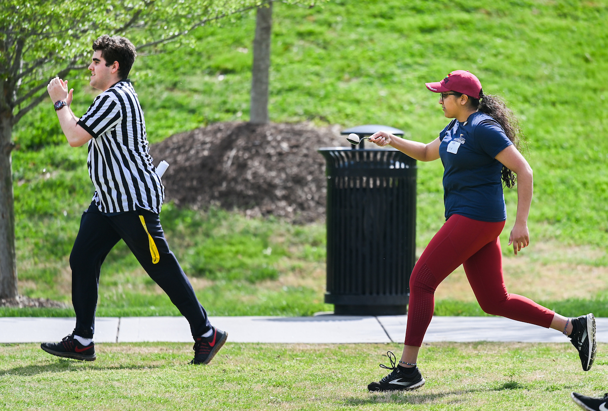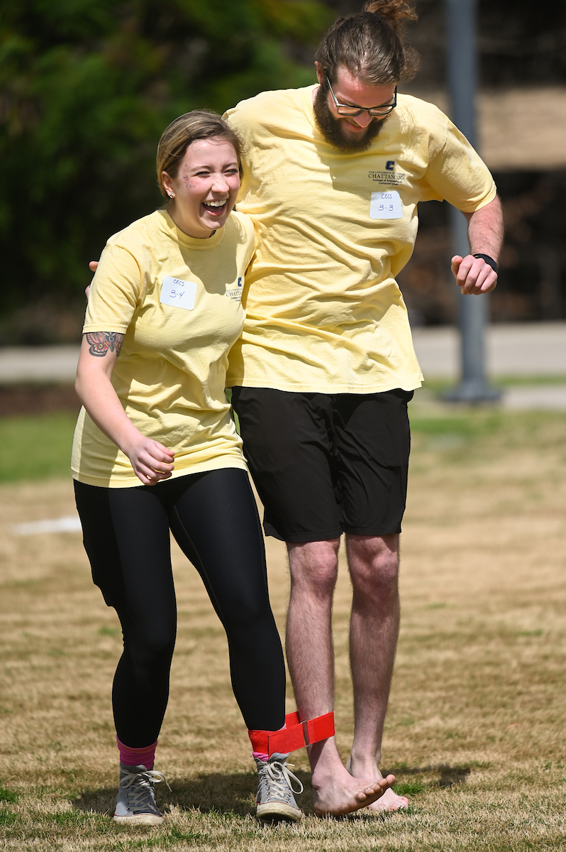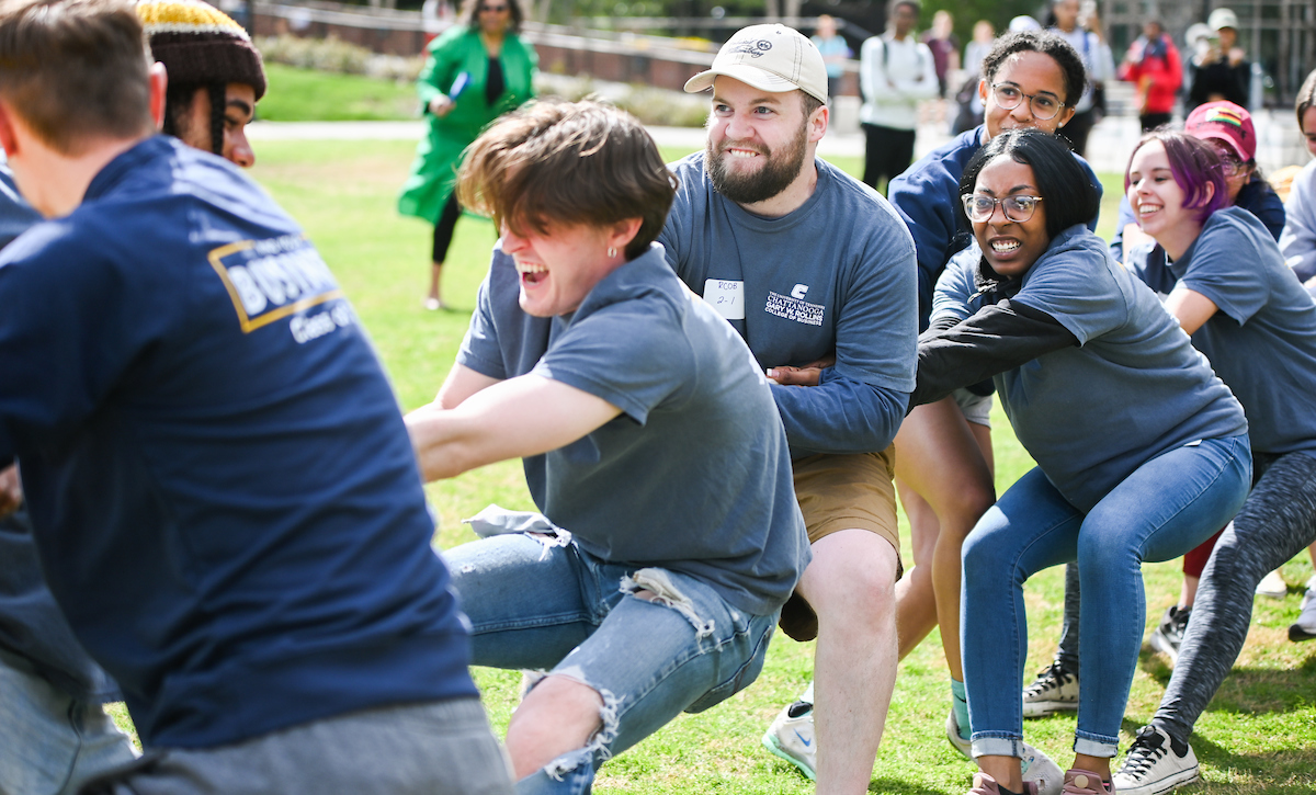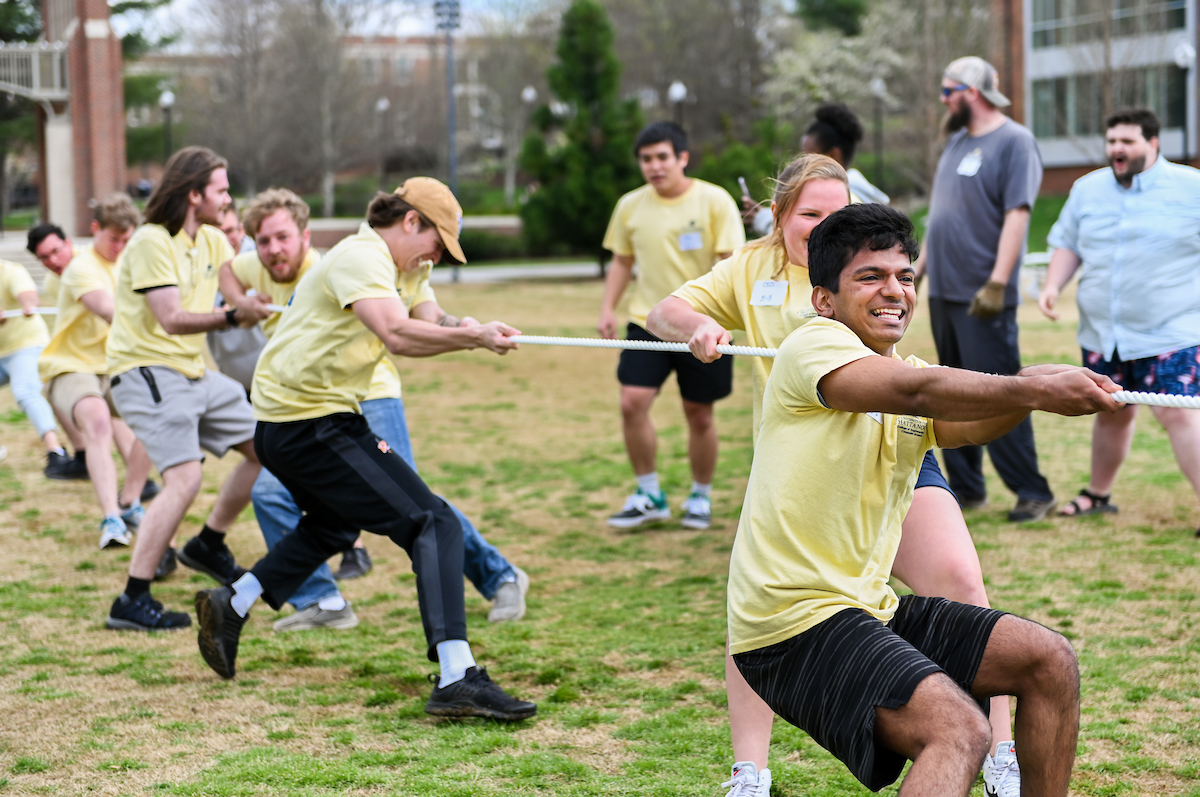 Teams from the Colleges of Business and Engineering faced off Thursday on Chamberlain Field for the first Field Games. The “heated” competition included egg and three-legged races, cup stacking, cornhole, tug of war and lots of laughing. The College of Business was the ultimate champ. In the photos below, Business is in the blue shirts and Engineering in the yellow.