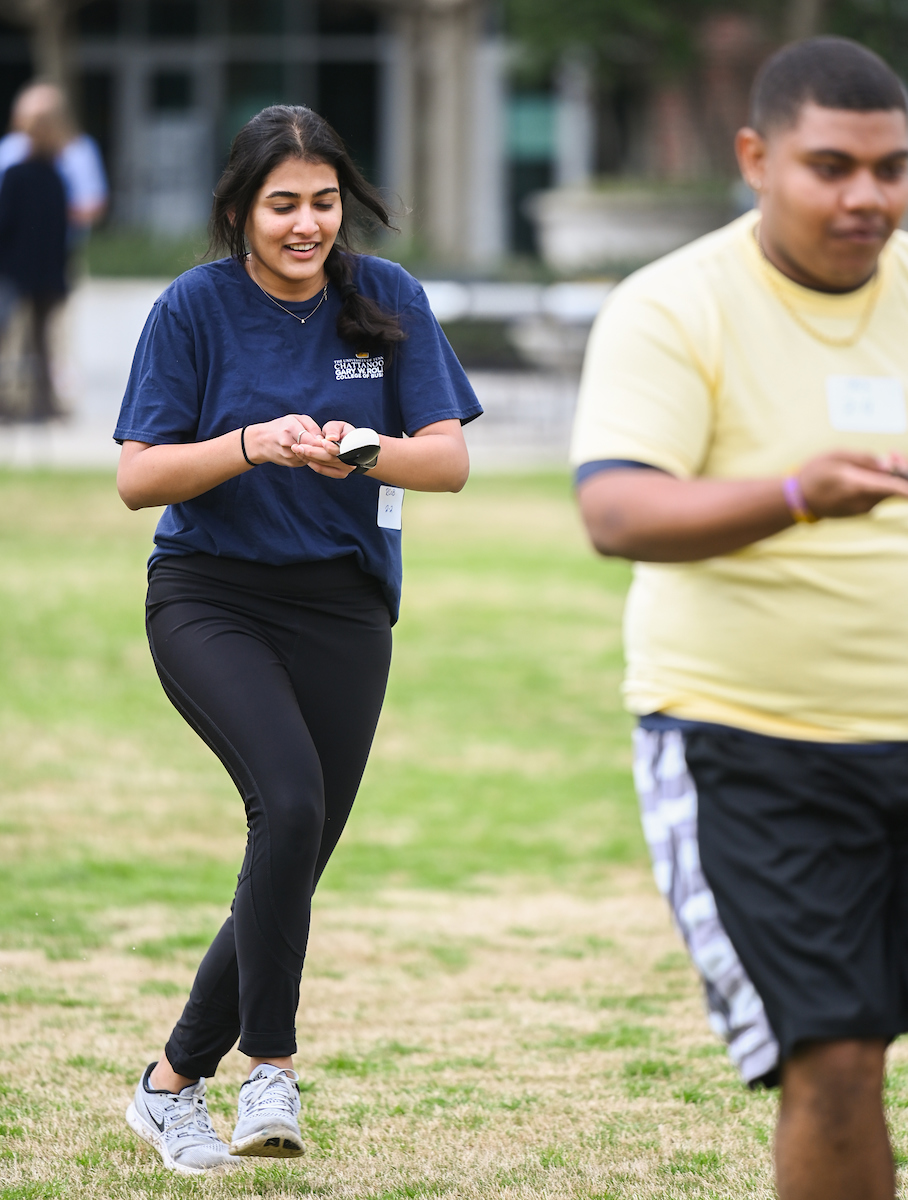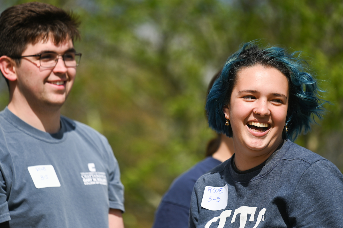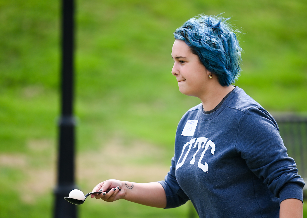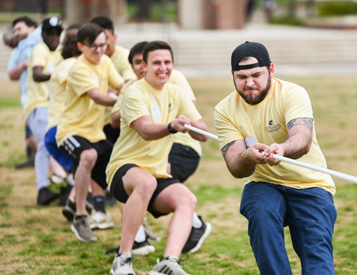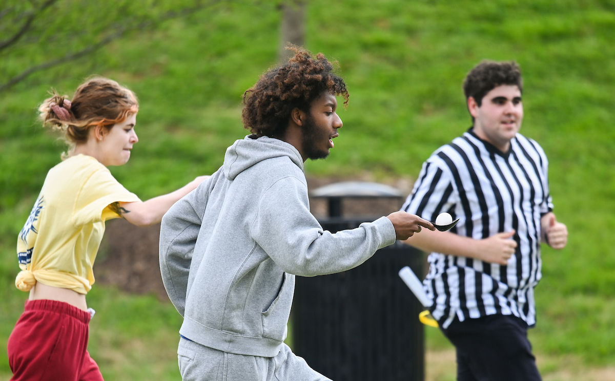 Teams from the Colleges of Business and Engineering faced off Thursday on Chamberlain Field for the first Field Games. The “heated” competition included egg and three-legged races, cup stacking, cornhole, tug of war and lots of laughing. The College of Business was the ultimate champ. In the photos below, Business is in the blue shirts and Engineering in the yellow.