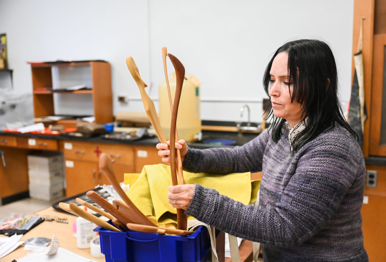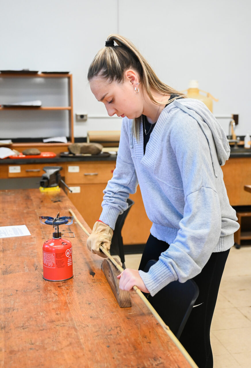 Before the hands-on activities can take place, though, tools have had to be constructed. Since the beginning of the semester, five anthropology interns and several history department student volunteers have been building paleolithic tools like atlatls and darts in a Brock Hall lab.