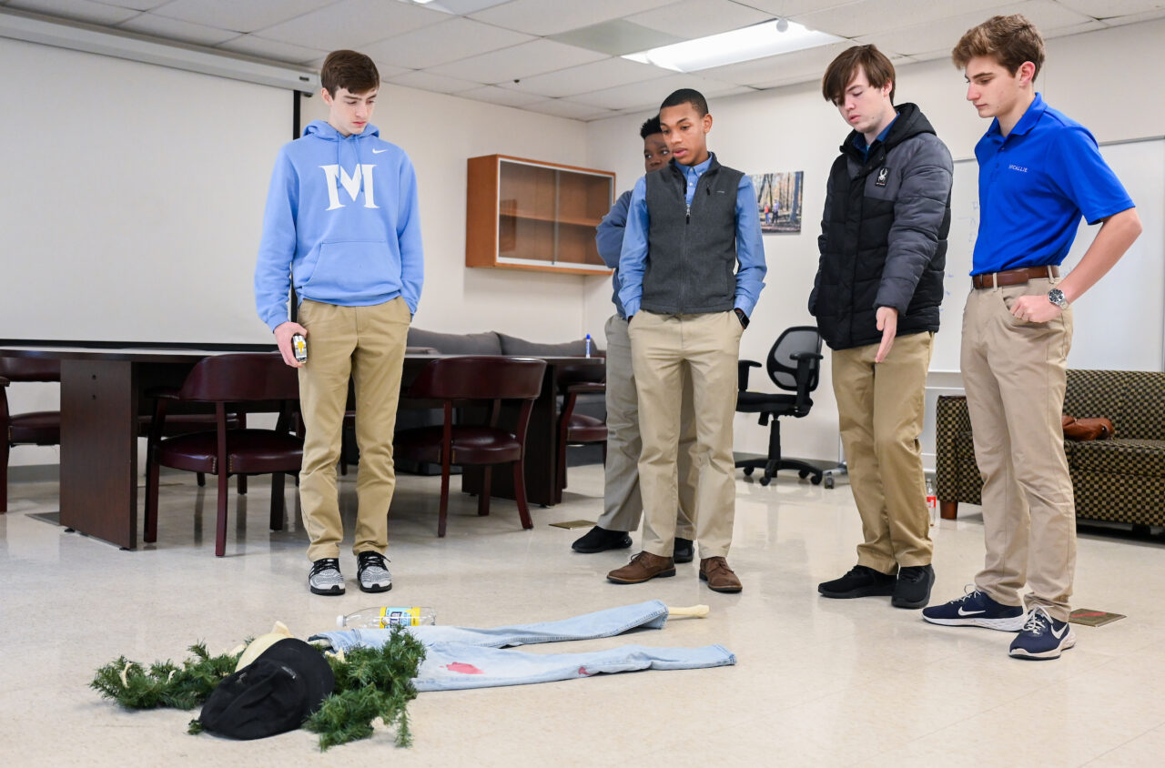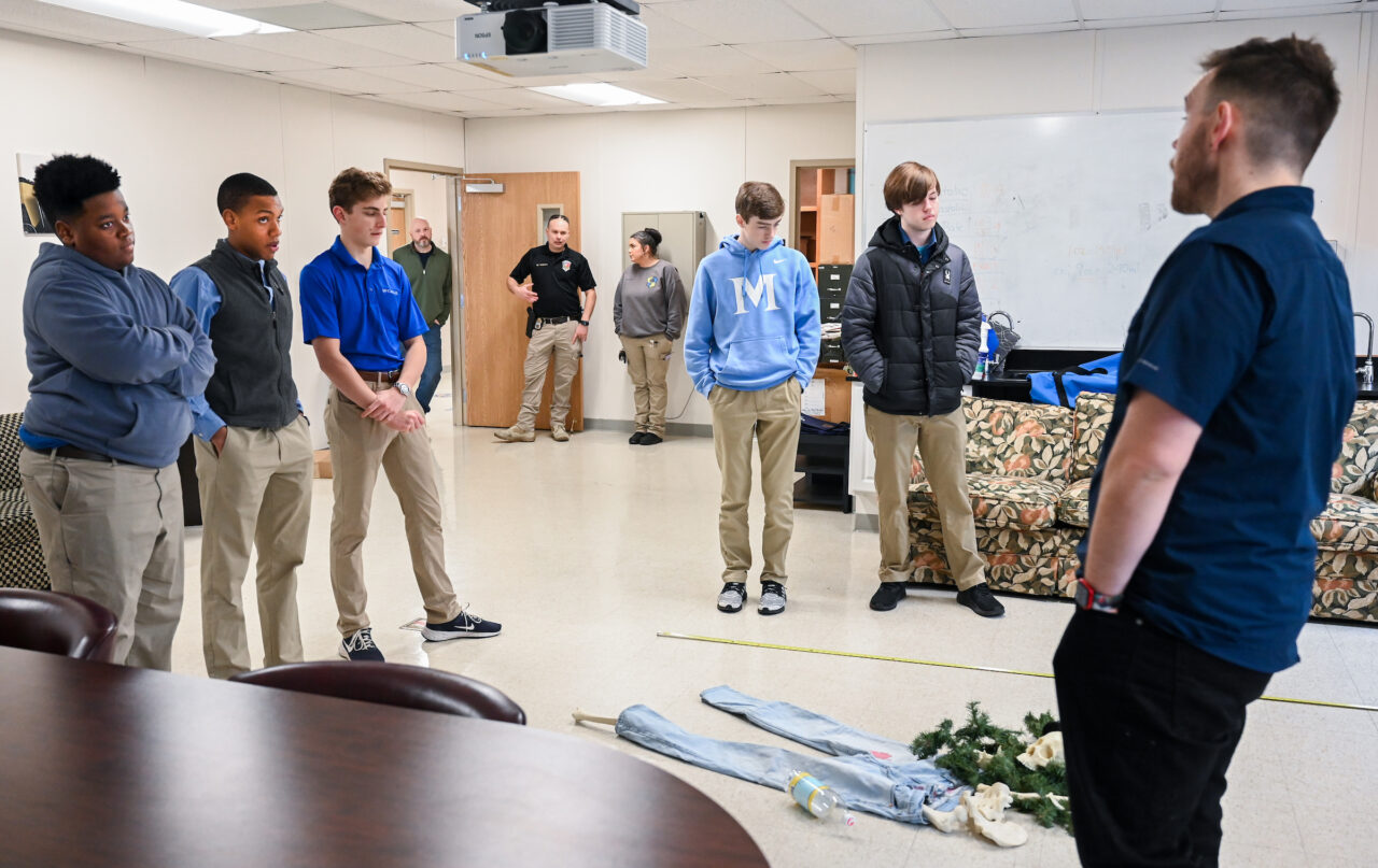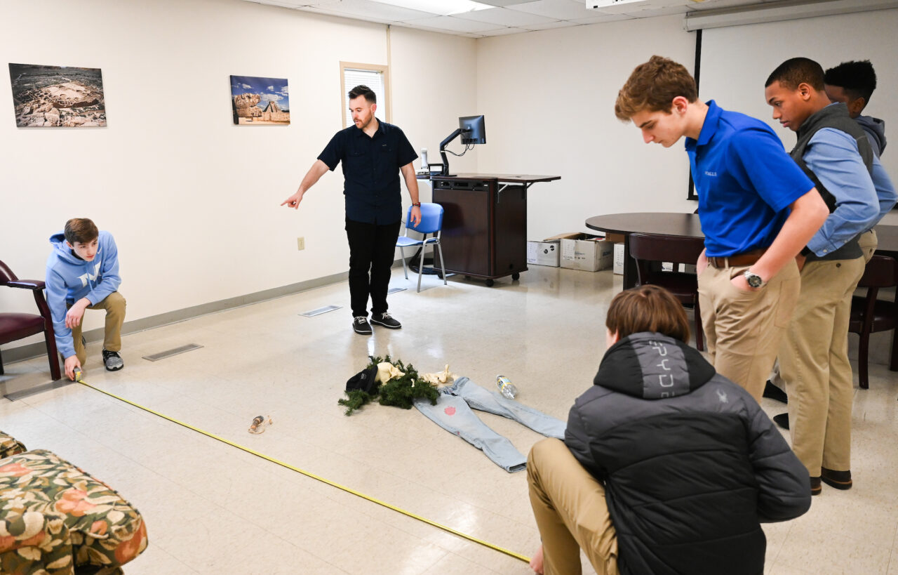 UTC Lecturer in Biological Anthropology Derek Boyd, left, takes McCallie School students Ethan Wagner, Isaiah Summey, Alex Senter, James Adams and Aubrey Raff through a mock crime scene. Photo by Angela Foster.