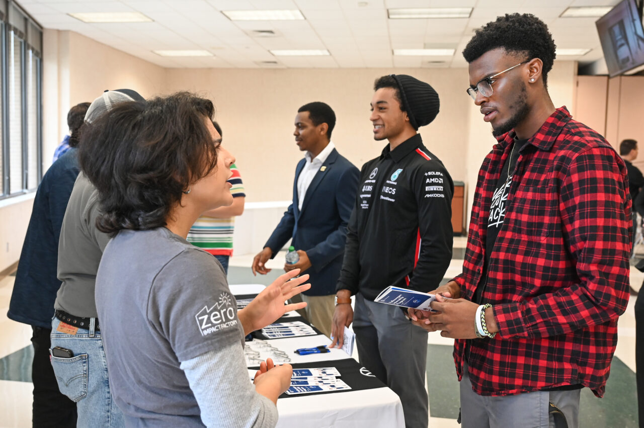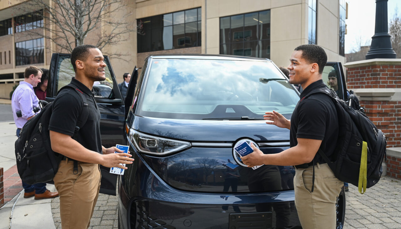 VW staff members talked with students about positions in numerous disciplines, including innovation, finance, engineering, computer science, business and human resources. In addition, an ID.4 and the new VW bus were parked next to the silver Power C adjacent to the University Center.