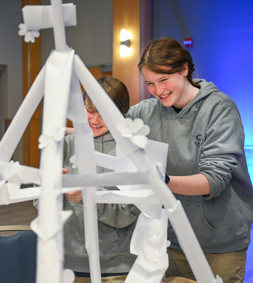 The judges scored on innovation, aesthetics, the structural ability of the coaster, how fast a marble could travel through it and how many times the marble reached the end. The paper coasters had to be over three feet tall and include a loop and a jump.