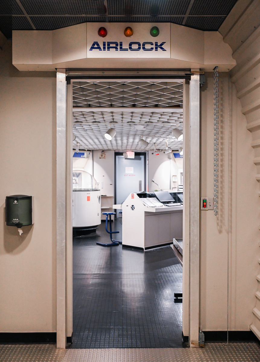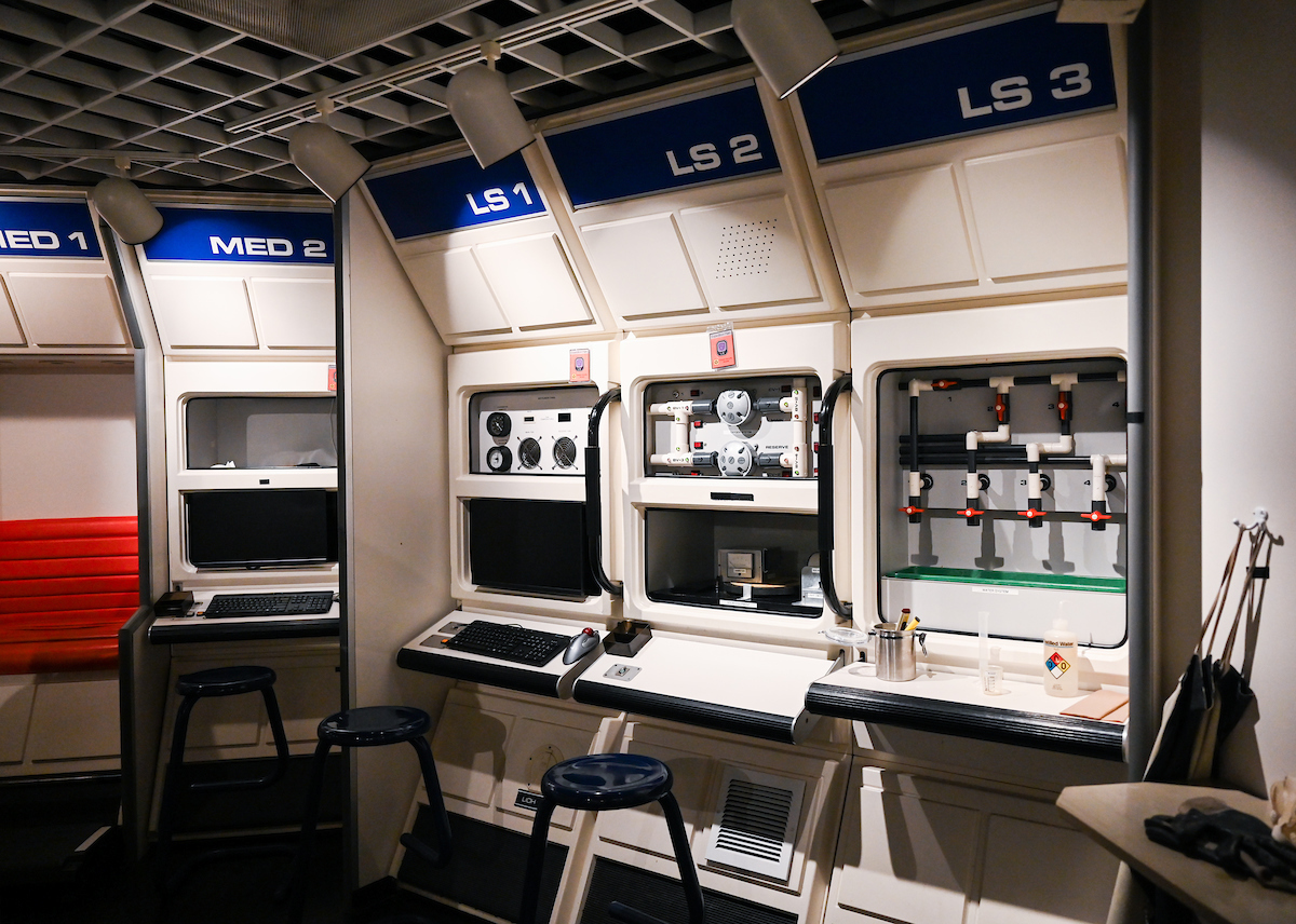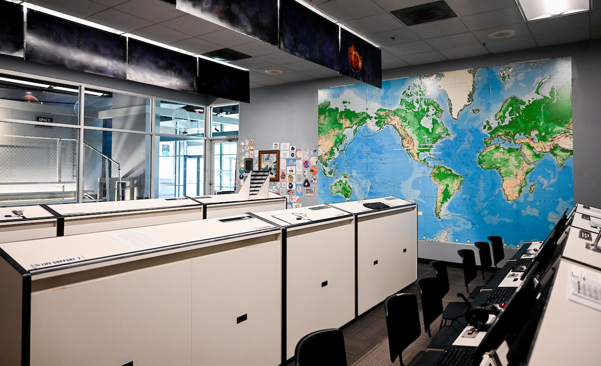 The center houses a model mission control room, a flight simulator and a spacecraft for experiments. It also has multiple breakout rooms for additional activities or educational opportunities.