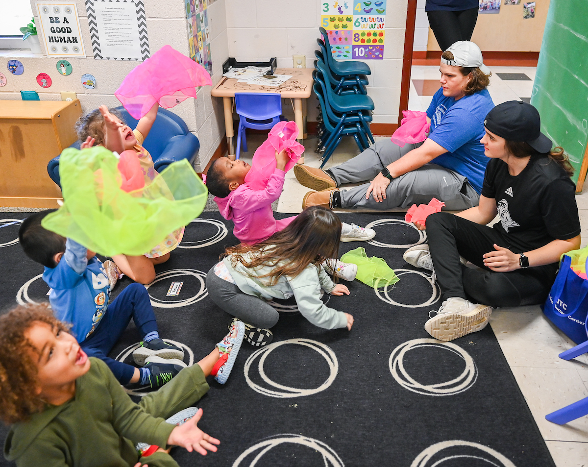 The preschoolers beamed as they joined in—only slightly more excited than the UTC students leading the chant. This final cheer marked the end of a carnival where children moved through activity stations designed by UTC students.