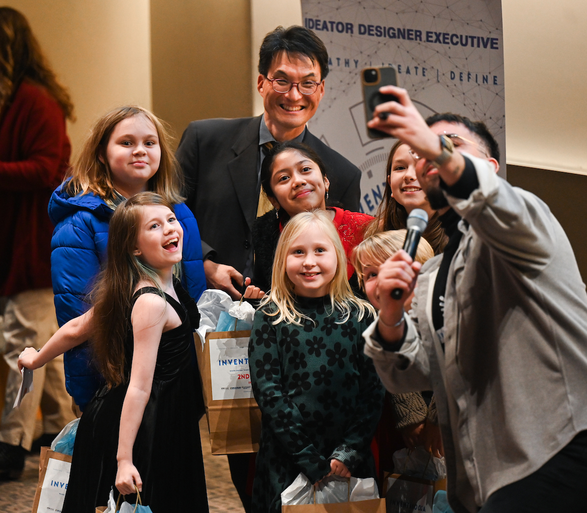 STEM School Chattanooga students Neal Khera, left, Maliki Lee and Josh Bun take a selfie with Inventanooga Program Director Kyle Carrasco and Dr. Subin Im after their team won the Inventanooga 2024 executive pitch competition. Photo by Angela Foster.