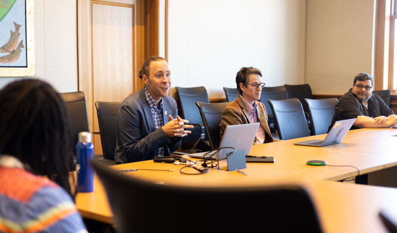Neighborhood Program Specialist Steve Lamb (right) and Office of Innovation Delivery and Performance Administrator Tim Moreland (center) gave students feedback on their work.