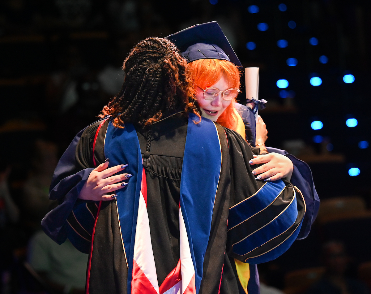 Principal Arielle Hayes hugs Kambriah Reynolds after the graduating senior spoke on behalf of the first cohort of University High. Photo by Angela Foster.