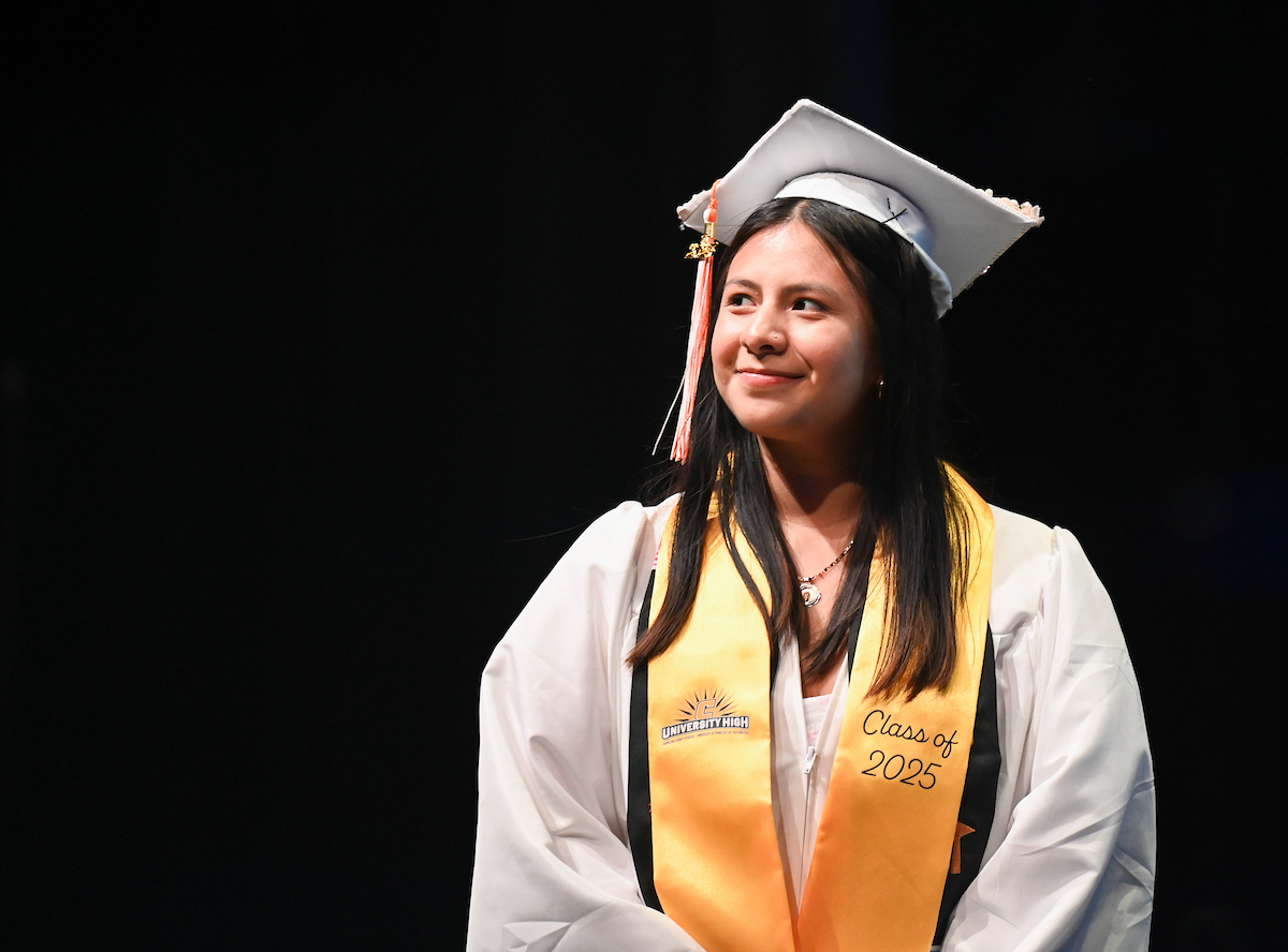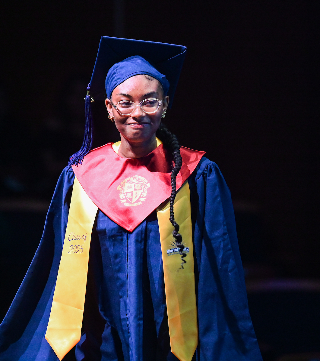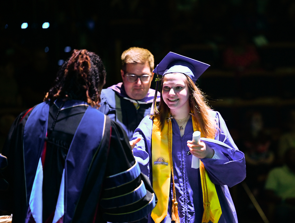 The University High ceremony also featured remarks from junior Malik Childress and English teacher Kate Knox, whom the students selected to speak on behalf of the faculty.