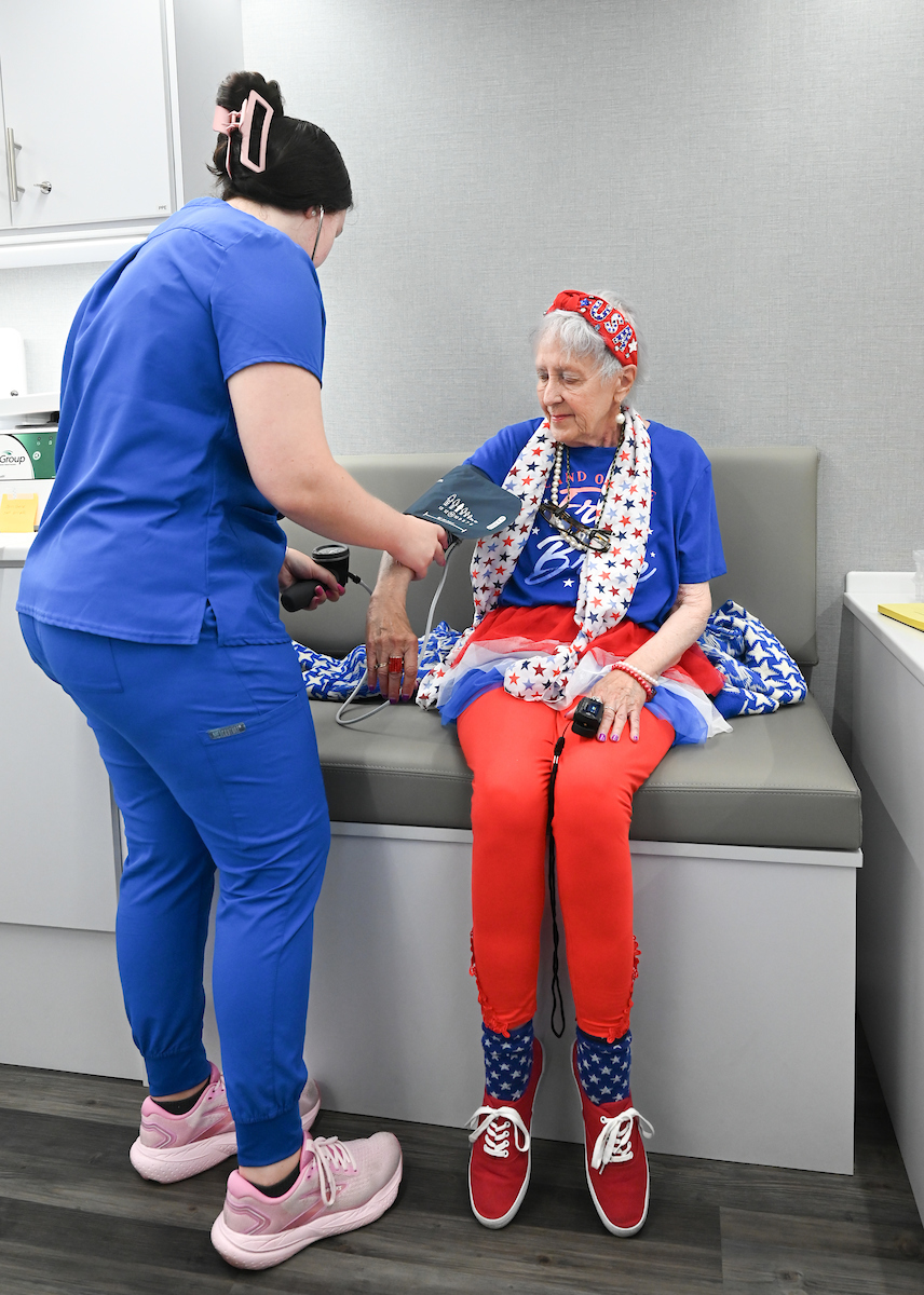 Carly Chastain takes a patient’s blood pressure.