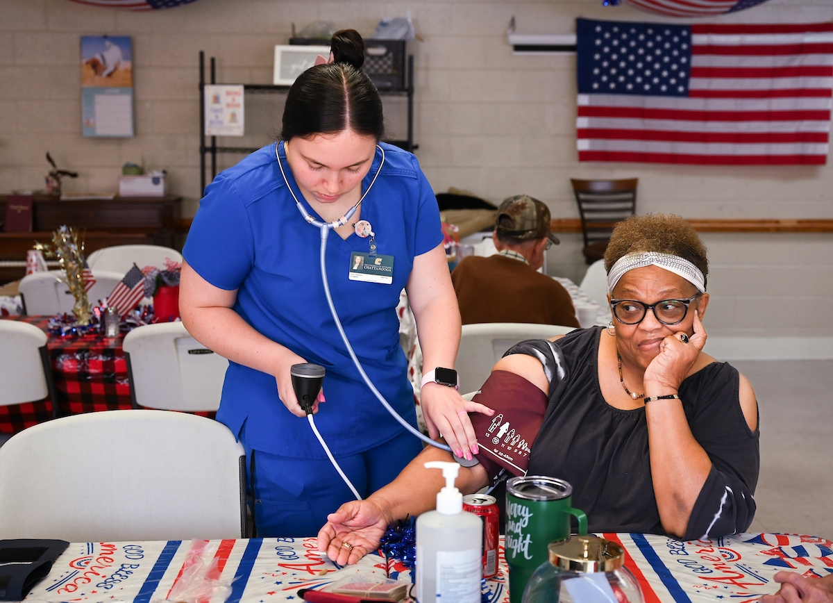 Dr. Kristi Wick takes a patient’s blood pressure in the Rhea Richland Senior Neighbors Center.