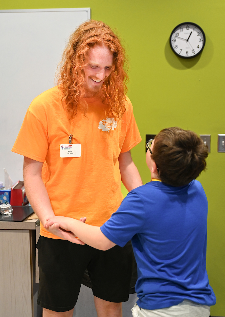 Brandon Gomes Toste arm wrestles Maverick during a session of the Creative Discovery Museum’s Friends’ Discovery Camps. Photo by Angela Foster.