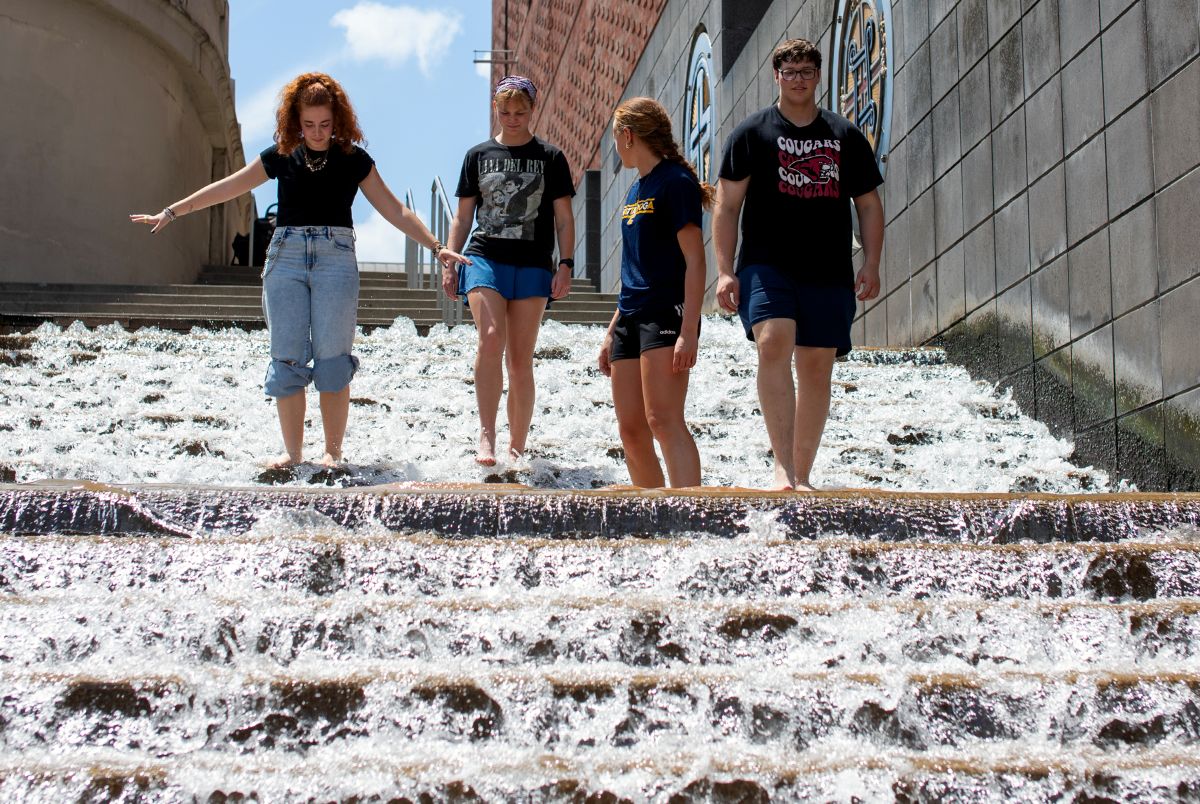 UTC Honors College students Izebella Lamb, left, Summer Wilson, Lilliana Jessen and Andrew Capelety flash the Power C while standing on the famous “water steps” in downtown Chattanooga as part of City as Text. Photo by Clara Paulson.