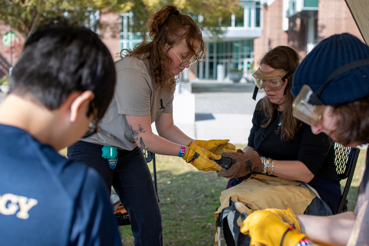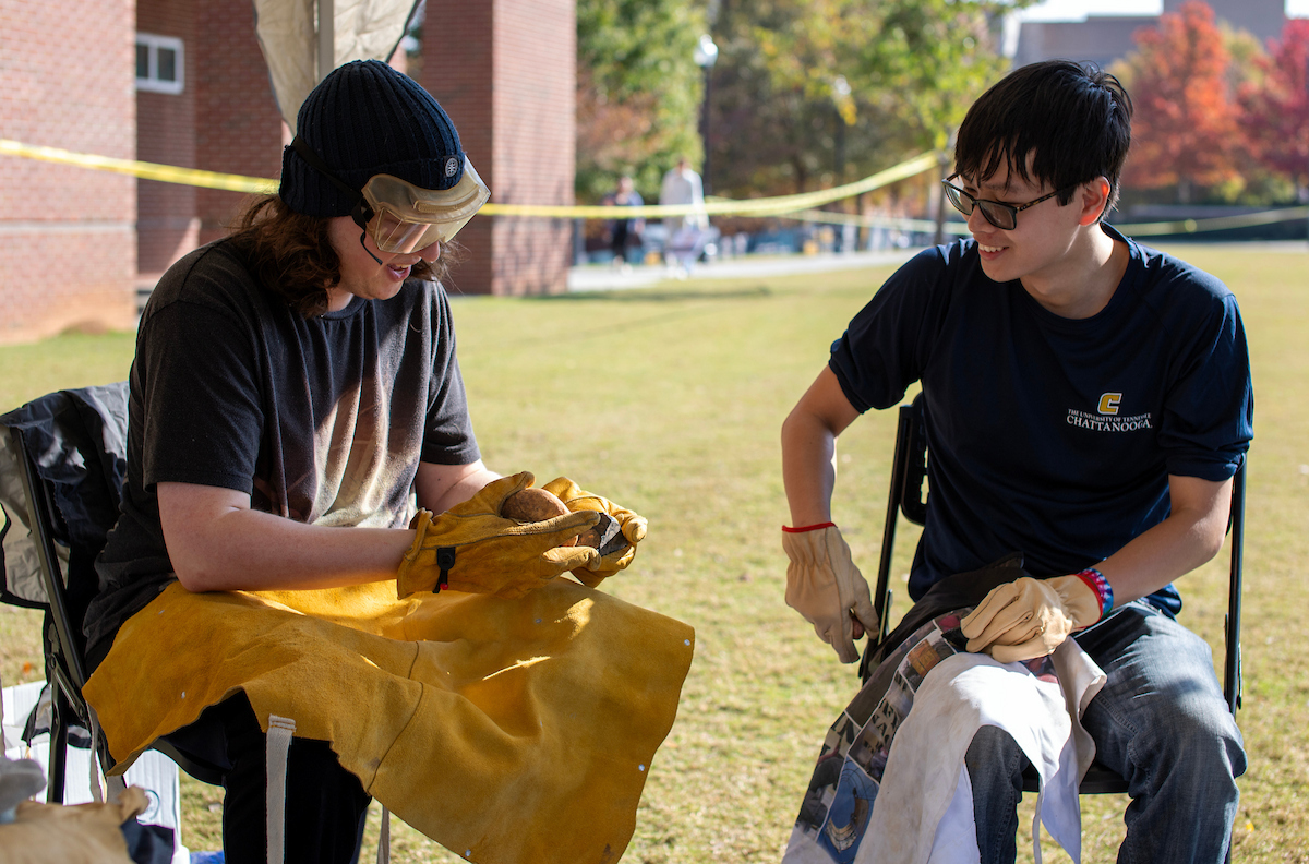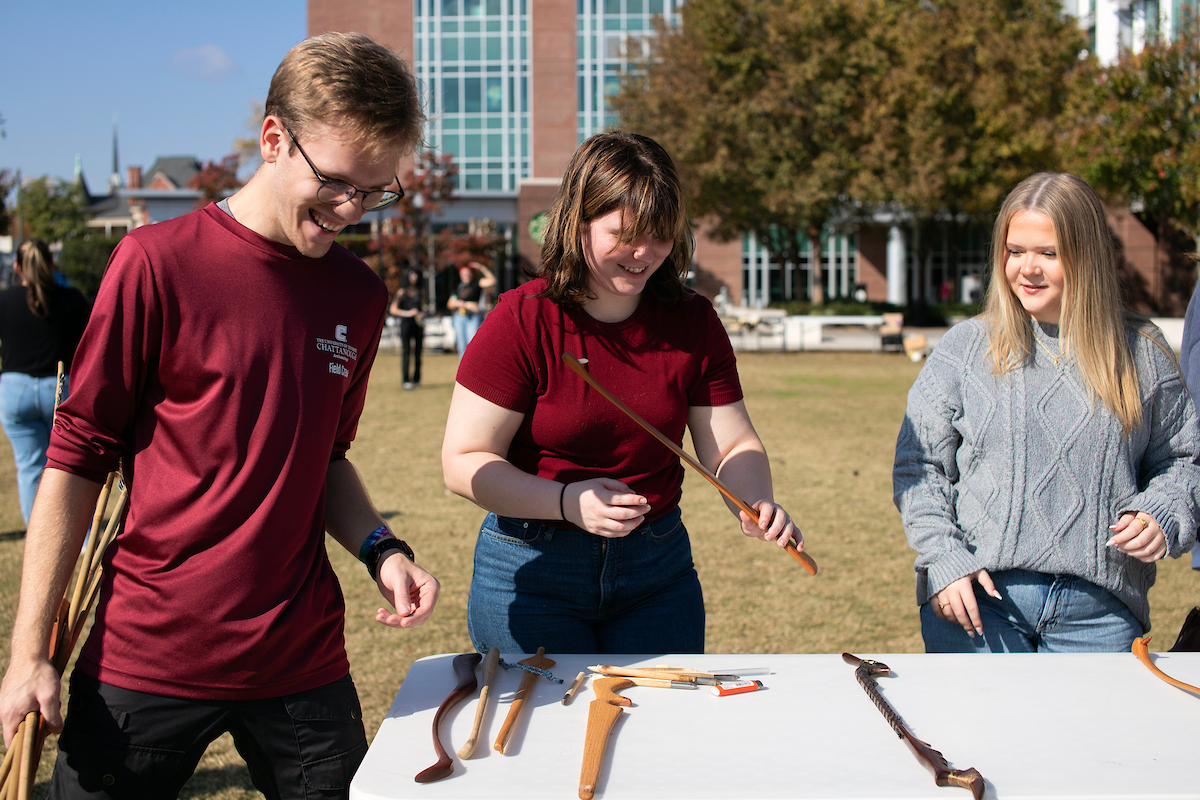 For a few hours on a recent Saturday afternoon, University of Tennessee at Chattanooga students and professors set aside their phones and laptops, opting for another type of technology. They gathered on Chamberlain Field to participate in Paleolithic skills and try their hand at atlatls, slings, friction fires, grinding corn and flint knapping.