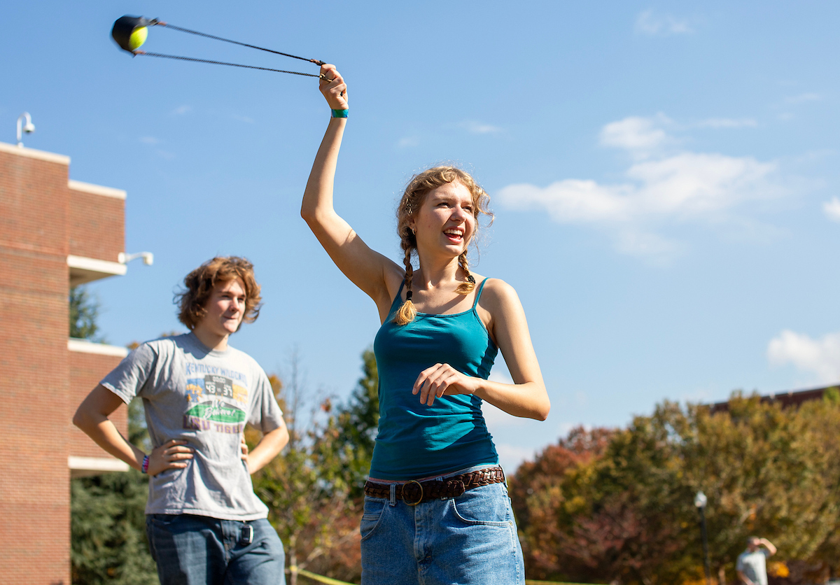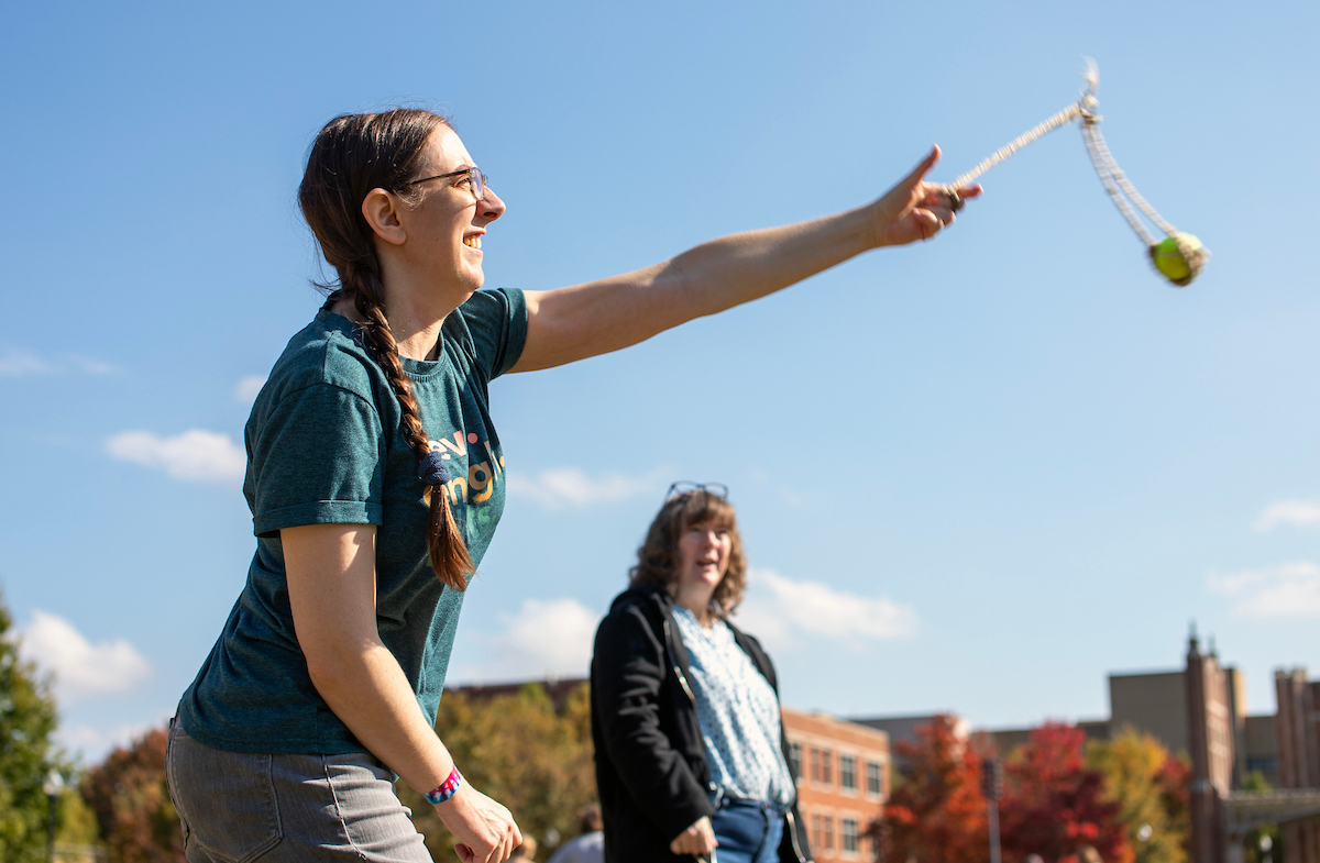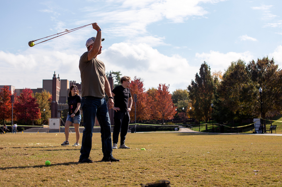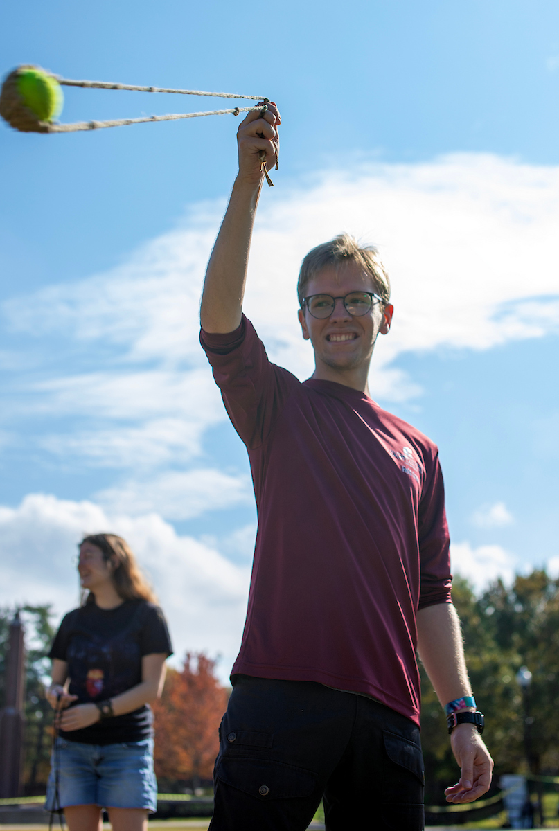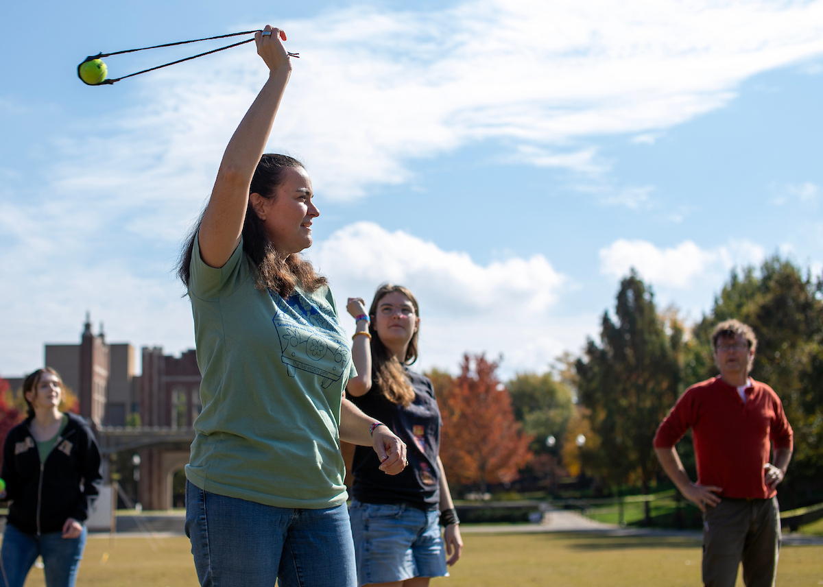 Anthropology major Chase Heistand displays his sling skills during a paleo skills workshop on Chamberlain Field. Photo by Clara Paulson.