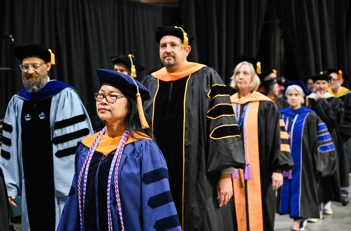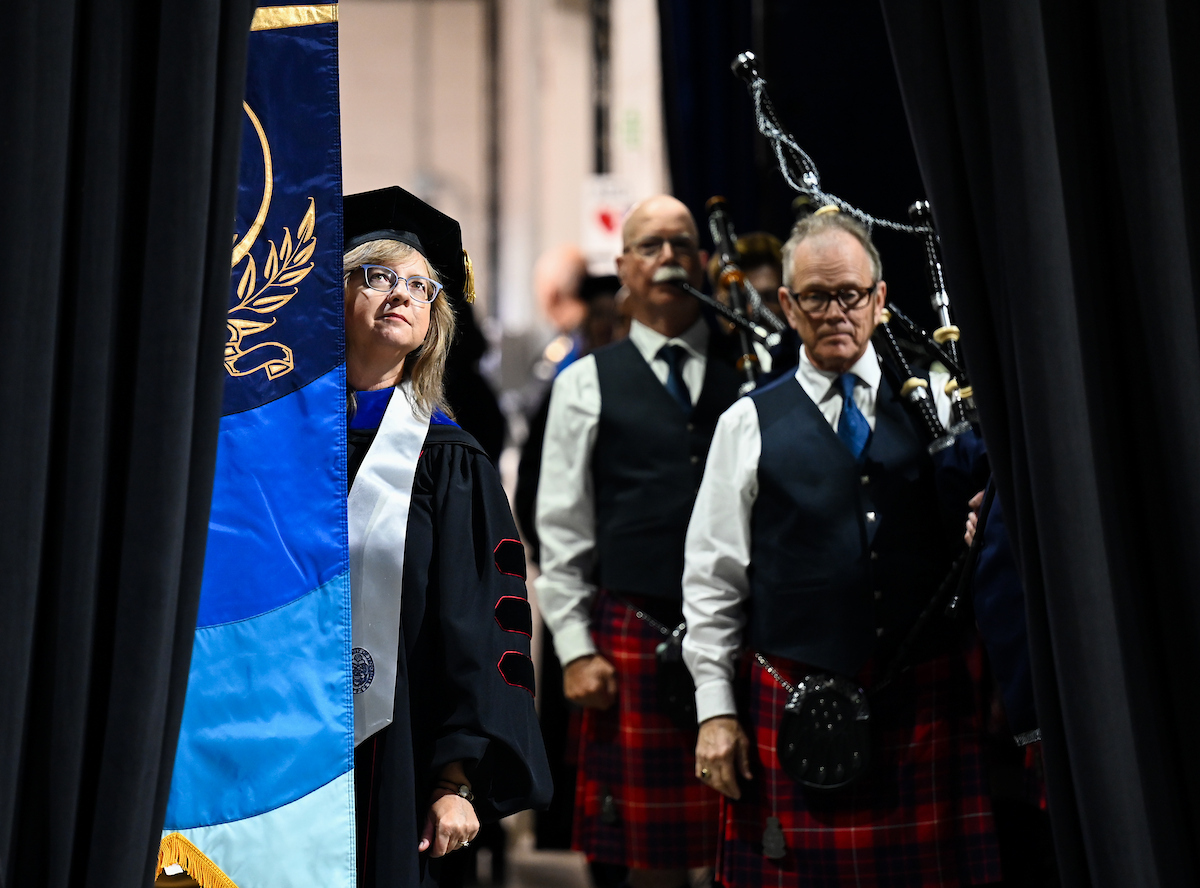 The procession entered McKenzie Arena to the sound of the UTC Brass Quintet, faculty banners rising above the crowd and the Chattanooga Pipe Band leading the way. At the center of it all was Dr. Lori Mann Bruce, taking part in her investiture as the University of Tennessee at Chattanooga’s chancellor.