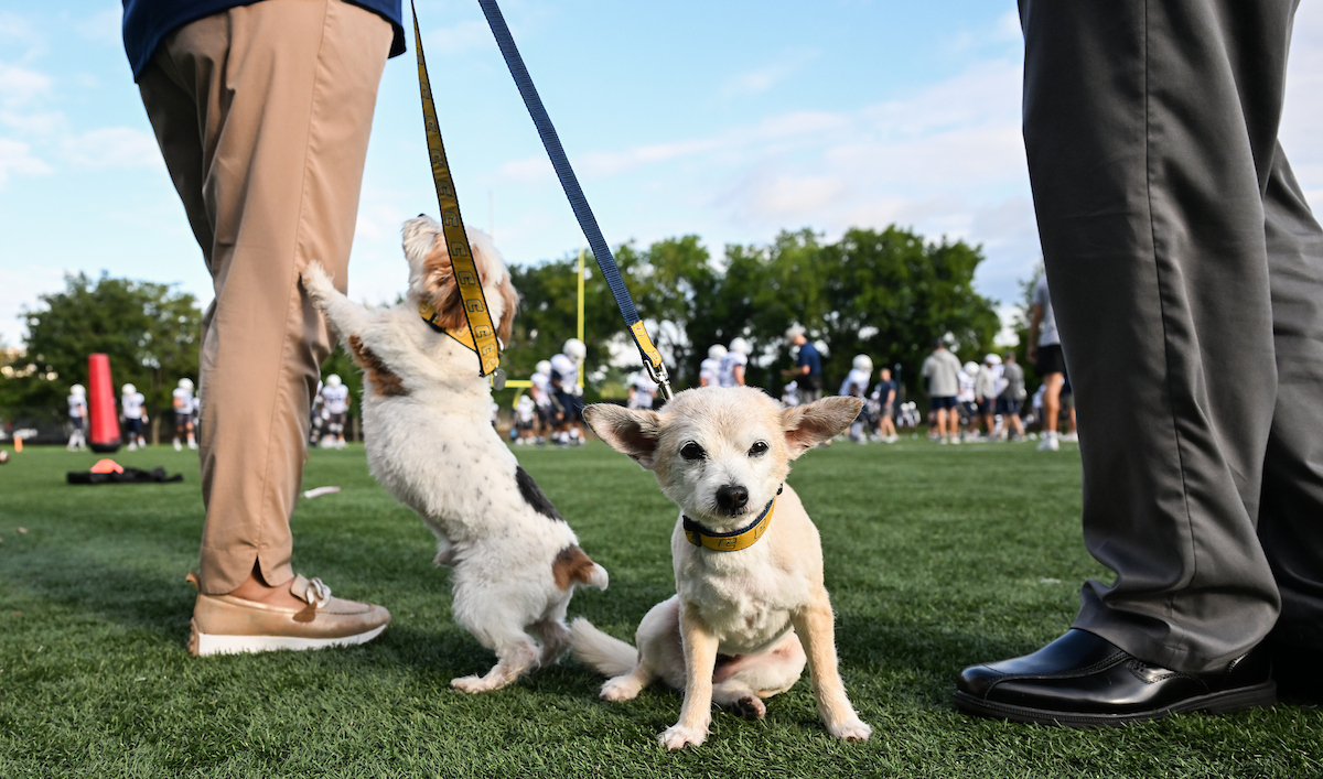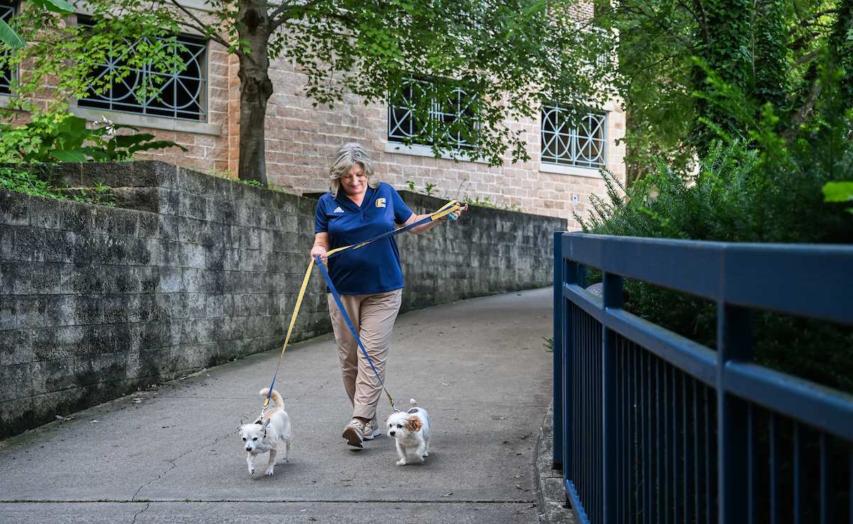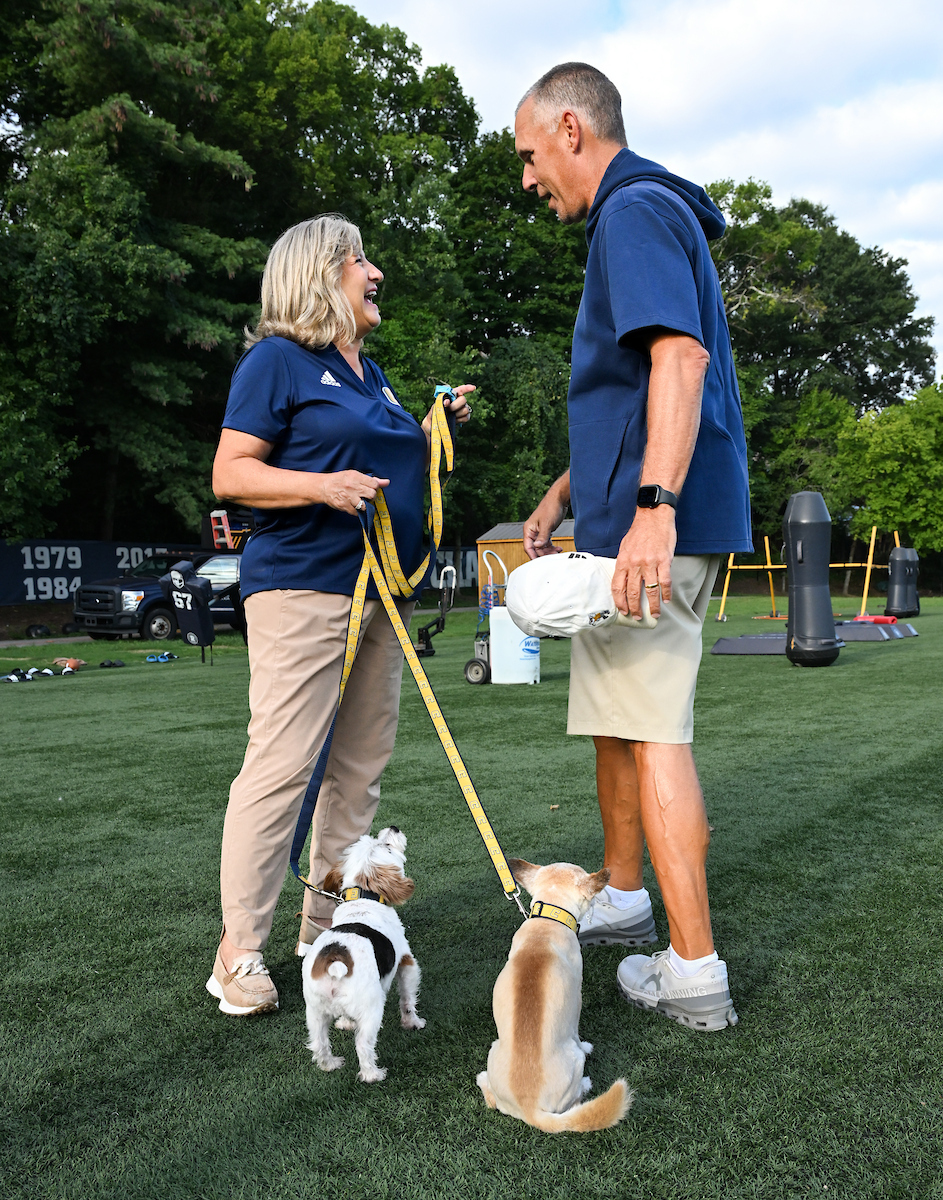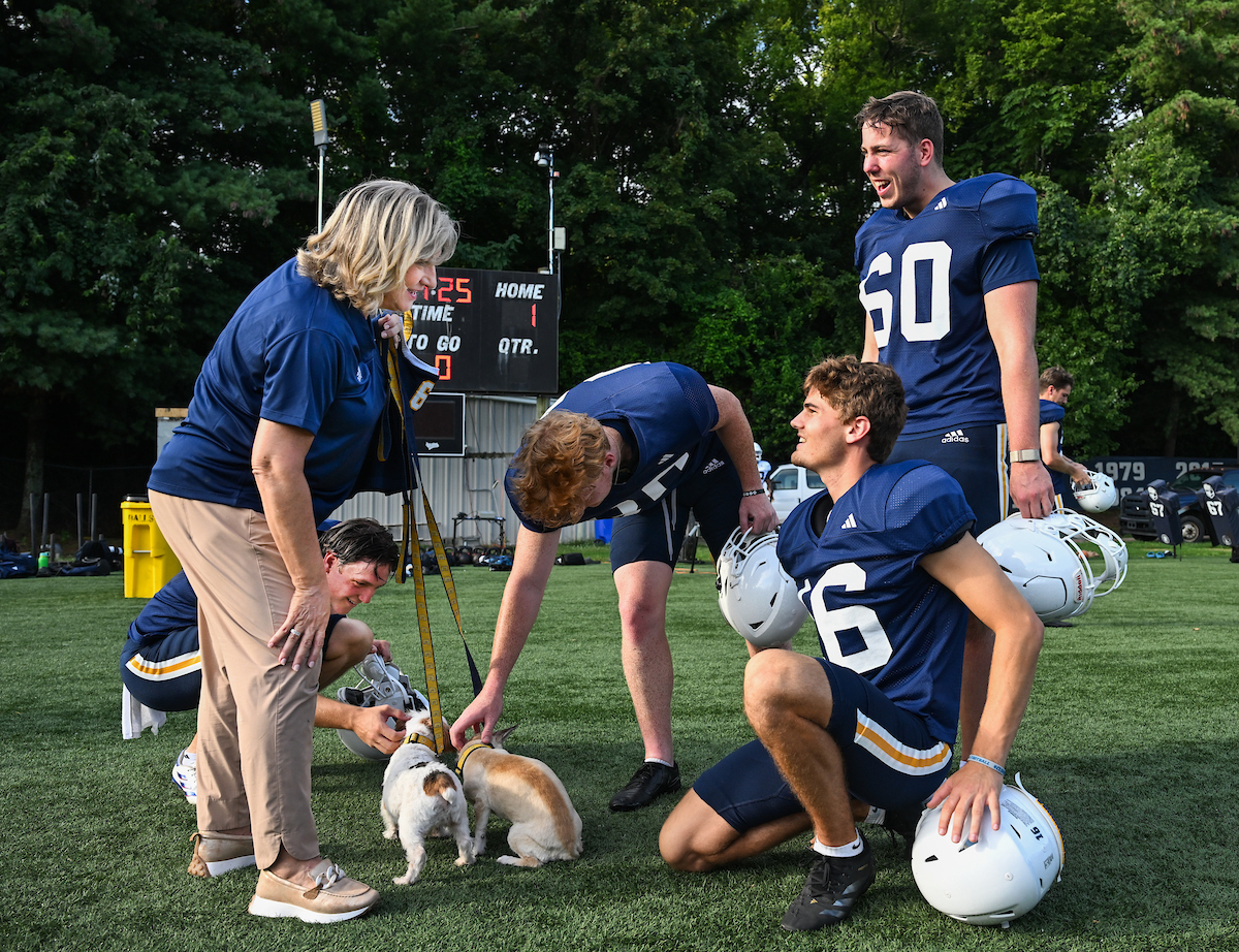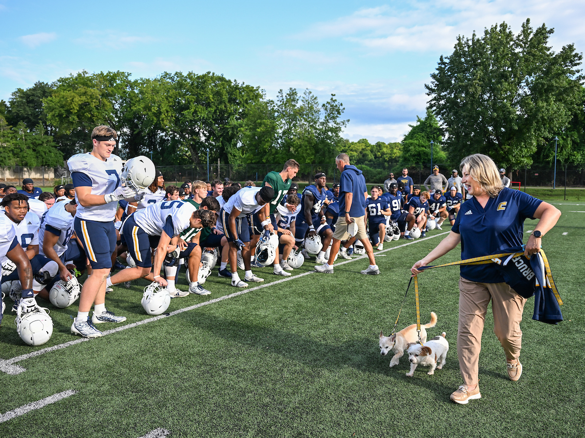 Ahead of the first home game, Chancellor Bruce introduced herself—and her dogs Lucy and Brody—to the Chattanooga Mocs football team. As they geared up to play against Tennessee Tech University, where Bruce served as provost just months earlier, she made her allegiance clear: she was team Mocs all the way.