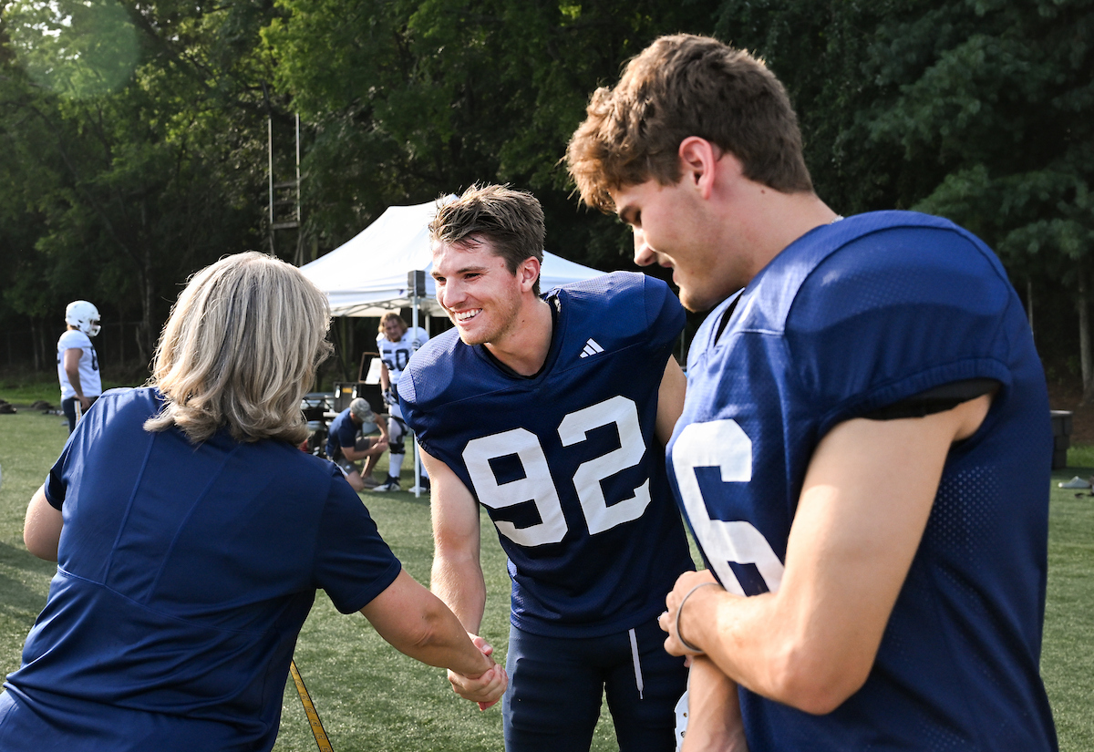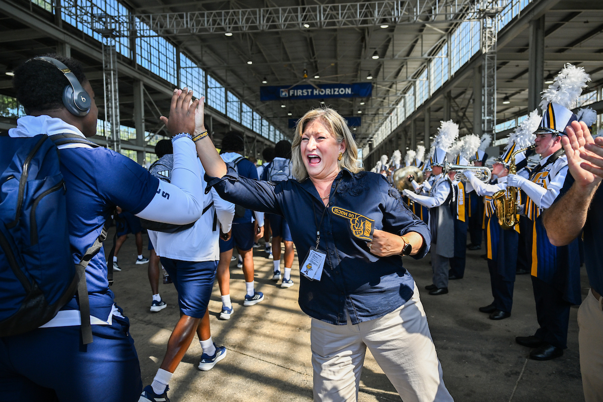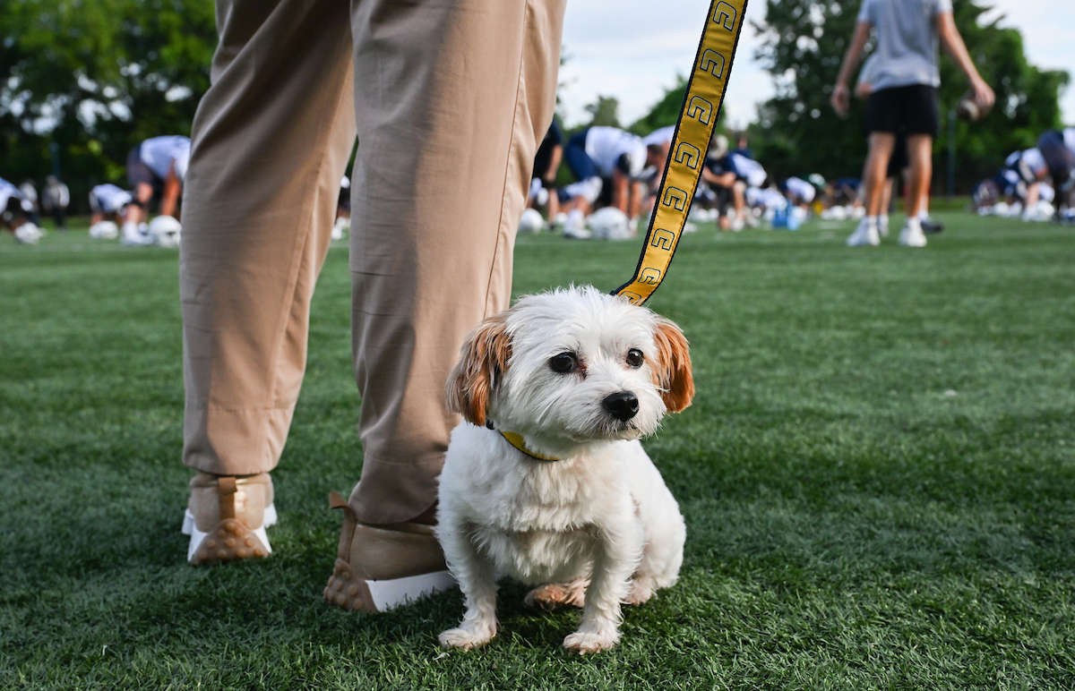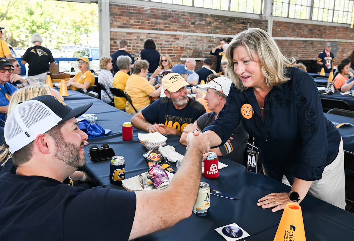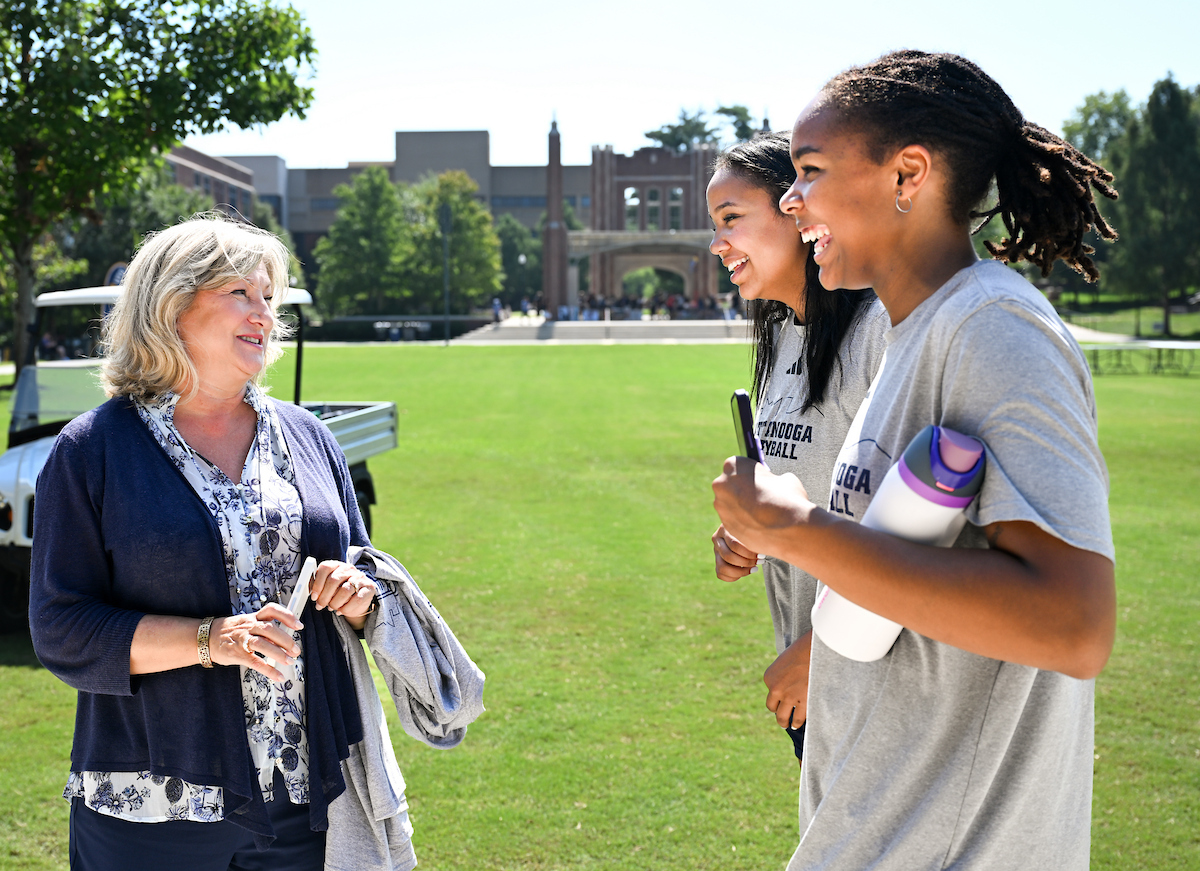 Ahead of the first home game, Chancellor Bruce introduced herself—and her dogs Lucy and Brody—to the Chattanooga Mocs football team. As they geared up to play against Tennessee Tech University, where Bruce served as provost just months earlier, she made her allegiance clear: she was team Mocs all the way.