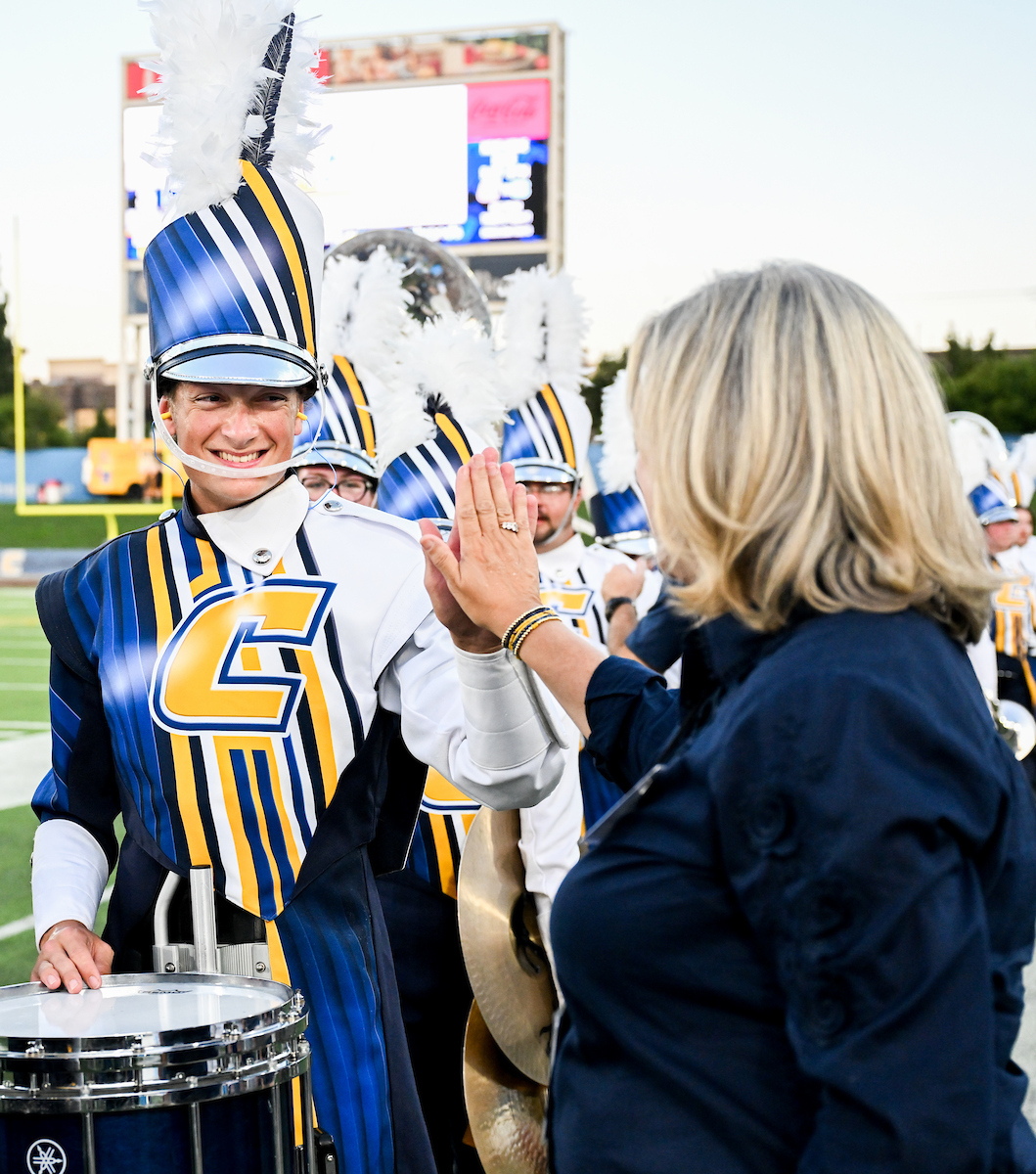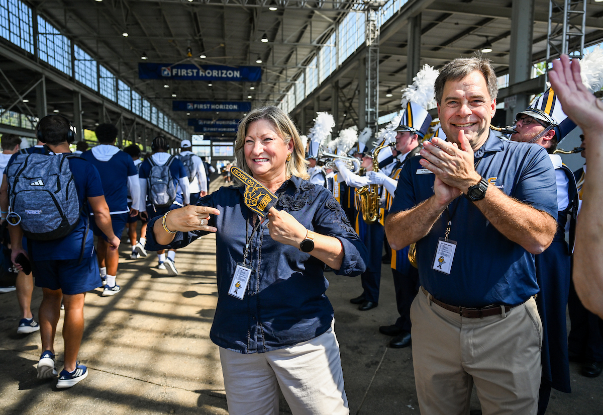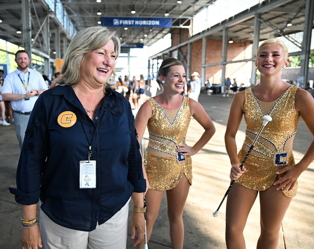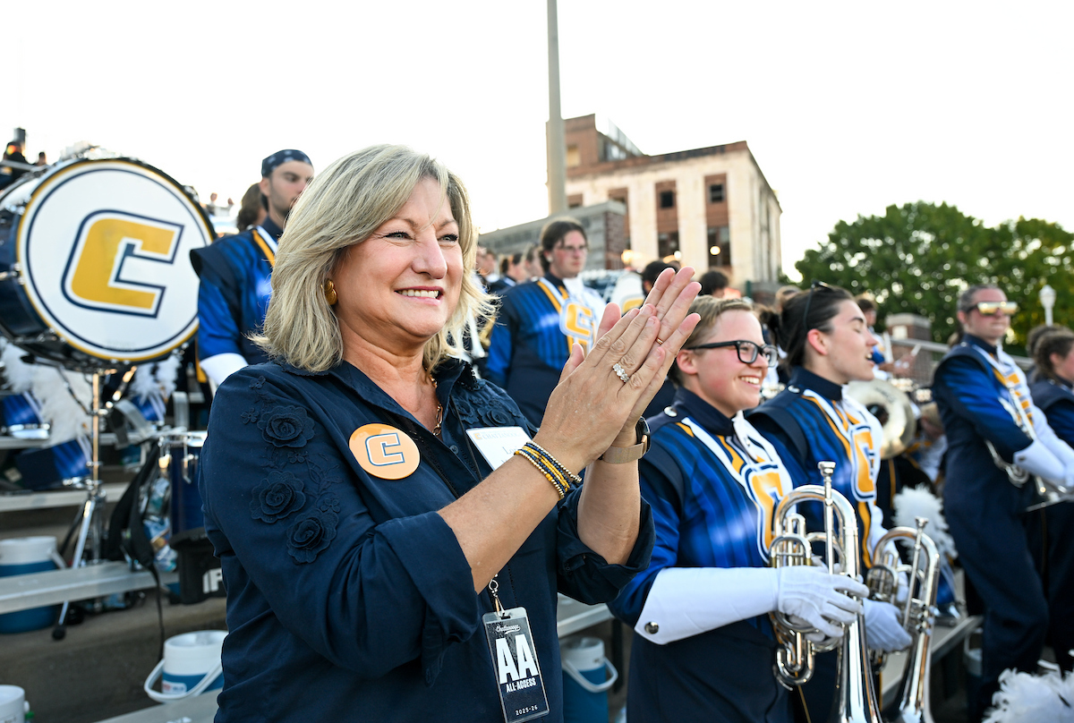 Bruce and her husband, Professor of Electrical Engineering JW Bruce, held up many “Power C’s” at the Mocs football home opener. She enjoyed spending time with the UTC twirlers, as she was a baton twirler herself in high school. The Mocs defeated the Stetson Hatters 63-0.