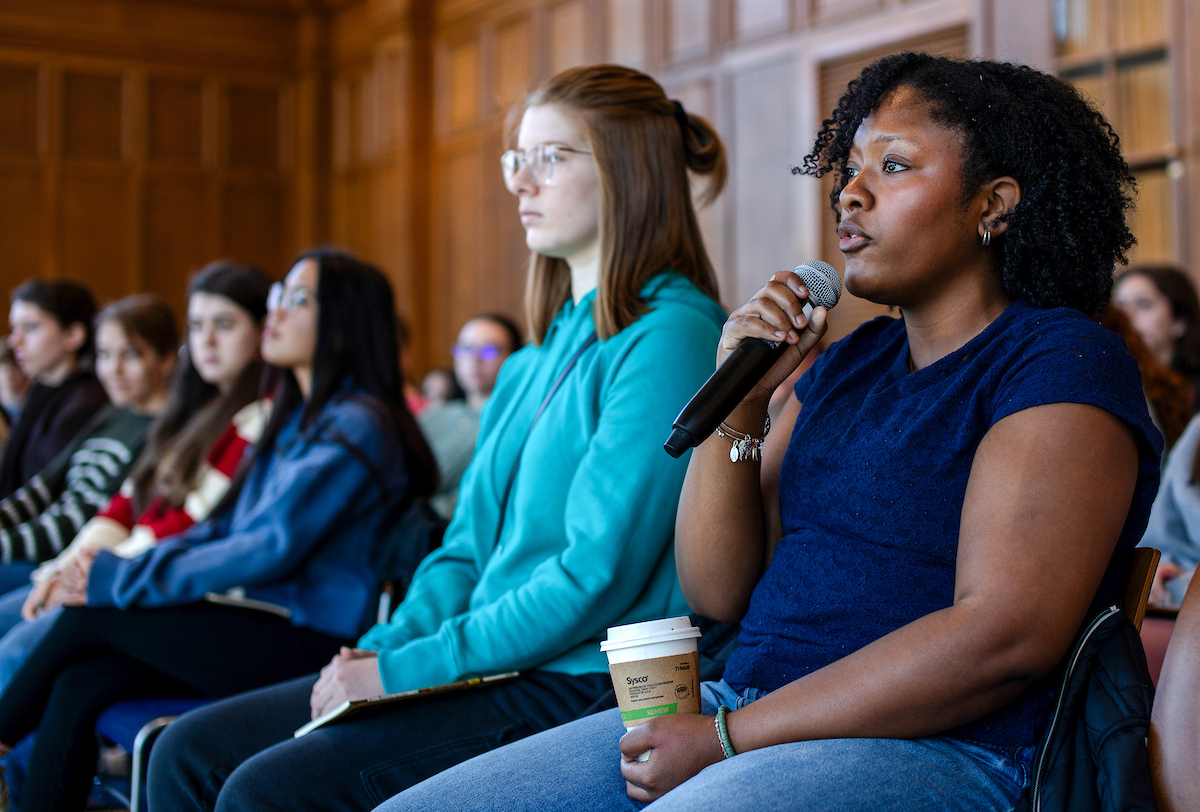 Freshman integrated studies major Abbie Banegas ask a question during the Q&A with Natasha Trethewey.