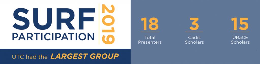 The fourth annual Southern Conference Undergraduate Research Forum (SURF) was held on November 1-3, 2019 at Wofford College in Spartanburg, S.C.. The SURF conference brings together more than 150 undergraduate researchers from around the region and showcases undergraduate research projects completed in the summer. UTC had the largest number of presenters this year with 18 presenters representing a diverse collection of UTC majors and disciplines.