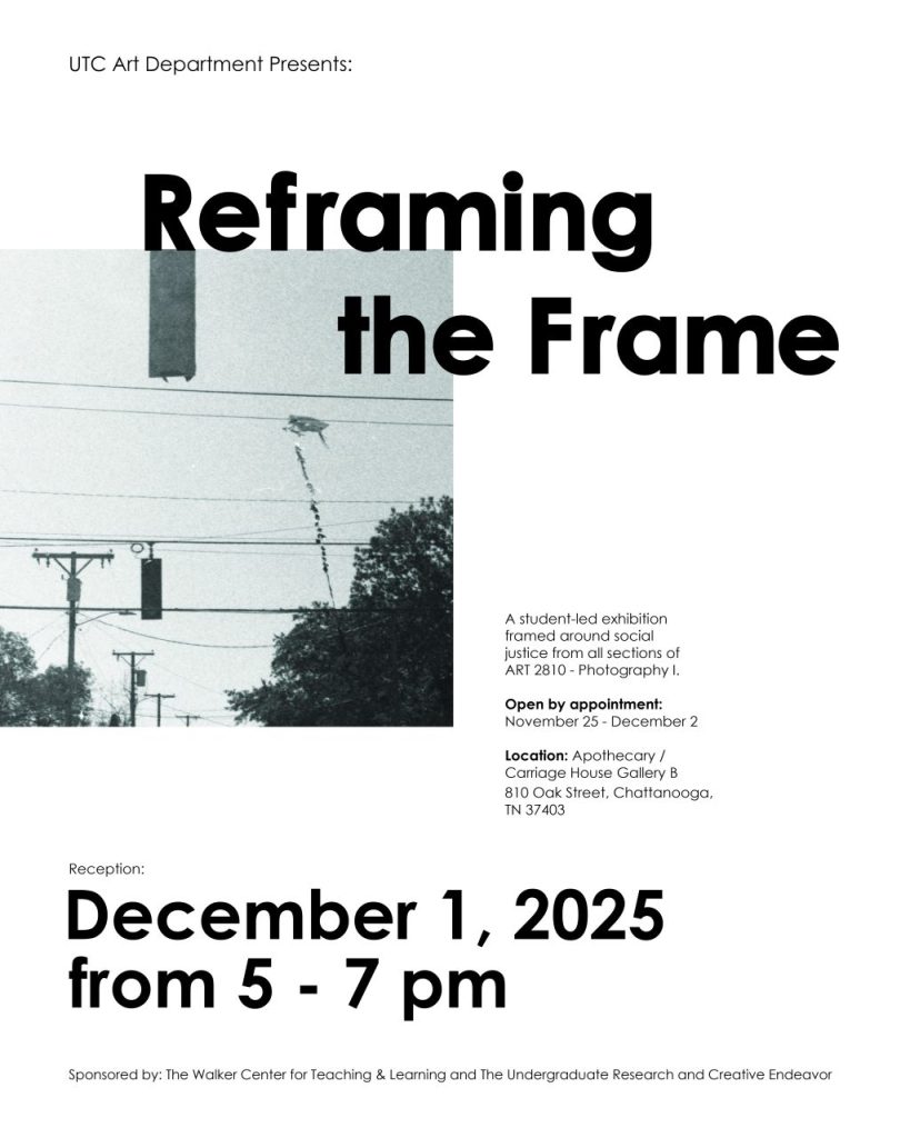 UTC Photo 1 students will showcase their work in Reframing the Frame, on view November 25 – December 2 at Apothecary / Carriage House Gallery B, 810 Oak Street, Chattanooga. The students received Office for URaCE support for their participation in the project.